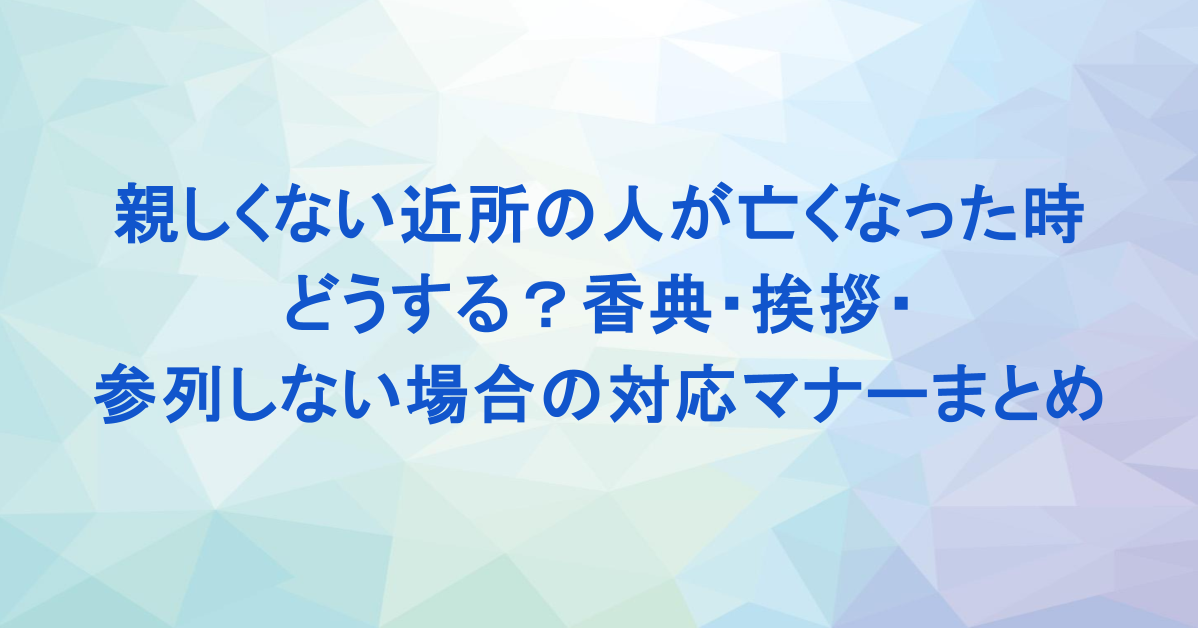 この記事では、親しくない近所の人が亡くなったときに焦点をあてて、無理のない範囲で気持ちを届けるための方法や考え方を、やさしく丁寧にまとめました。